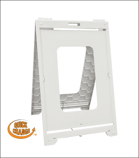 Folding A-Frame sign available in white or black with quick change sign access. Each sign comes with 2 full color one sided printed coroplast inserts to fit 24"x36" space!